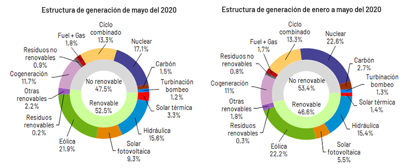 La energía eólica representó el 21,9% de la demanda eléctrica en España en mayo, la termosolar el 3,3% y la fotovoltaica el 9,,3%. El 52,5% de la generación mensual fue de origen renovable y el 70,8% se produjo a partir de tecnologías que no emiten CO2 equivalente. La demanda de energía eléctrica descendió en Baleares un 31,3% y en Canarias un 18,8% respecto al mismo mes de 2019.